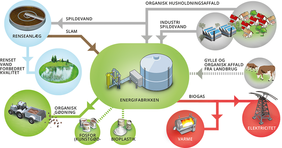 Groft og kort fortalt modtager Billund Vand & Energi spildevand og madaffald, som blandes, opvarmes og blendes, før denne masse bliver sendt ind i en af de to rådnetanke. Efter halvanden måned er massen blevet til biogas, som bliver lavet om til energi.